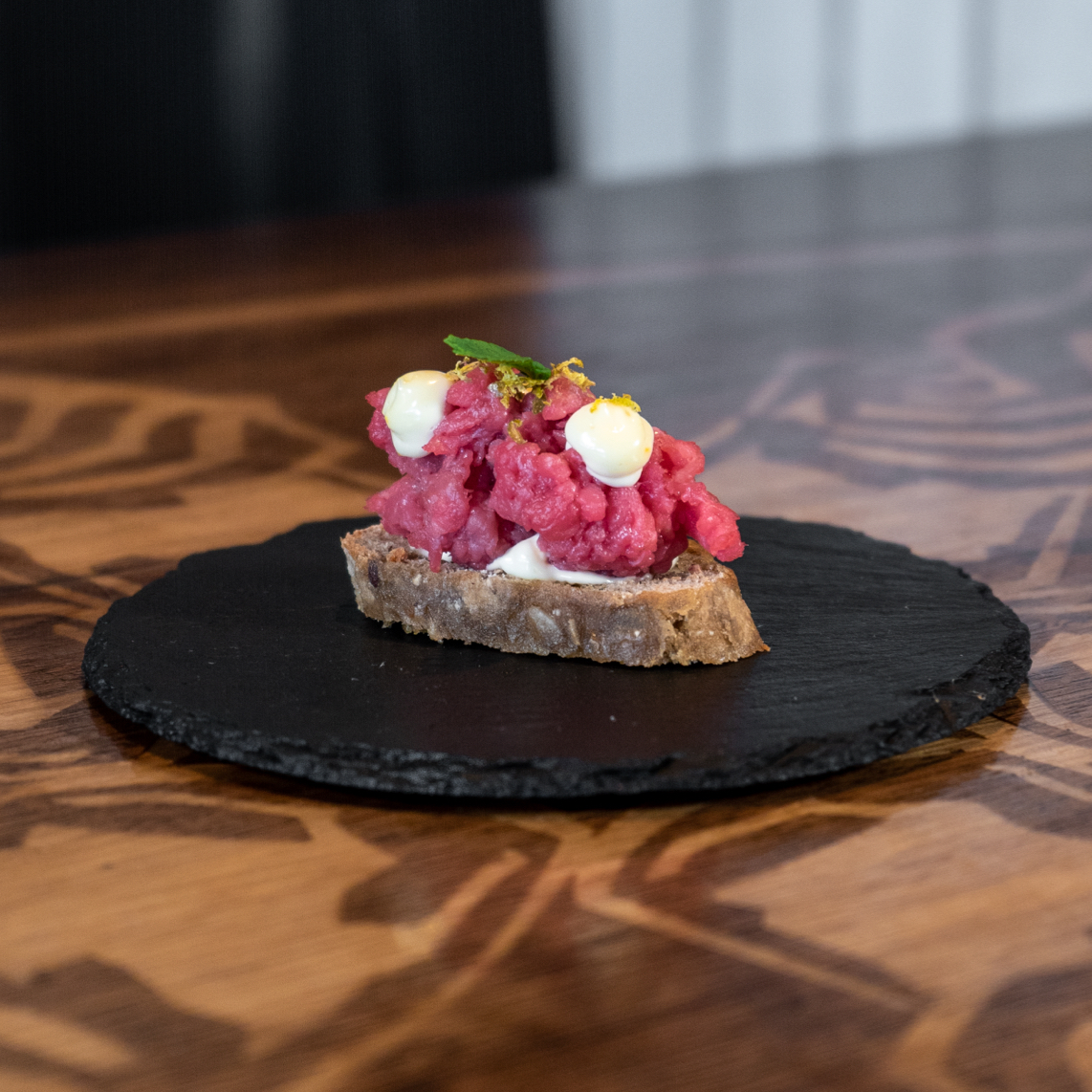 (TARTARE DI LIMOUSINE FRANCESE, CROSTONE DI PANE AI CEREALI ,MAYO AGLI AGRUMI ,LIME)